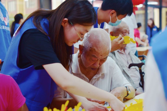 在上海市杨浦区久安养老院,同学们帮助老人们打扫卫生,整理床铺,晾洗衣物。在完成清洁工作后,同学们陪伴老人制作灯笼手工DIY。他们手把手地教爷爷奶奶如何制作,认真地给老人们讲解步骤,耐心地帮助他们整理材料,协助他们解决手工制作中的困难。在制作期间陪着老人们唠家常、讲笑话,给老人们带去欢笑和快乐。在大家的分工合作下,老人们都成功地制作了漂亮的卡通发光灯笼。现场,志愿团队还准备了美味的蛋糕,为当月过生日地老人举行生日仪式,许愿、吹蜡烛、吃蛋糕、为老人唱生日歌。
