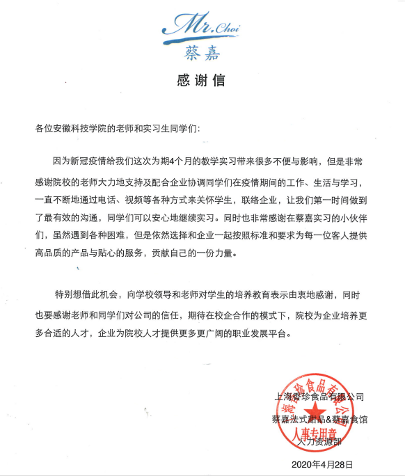 截至2020年4月30日,云博官方网站_云博(中国)股份有限公司,食品工程学院2017级烹饪与营养教育专业39名学生为期四个半月的校外专业实习正式结束。对于校外实习的这39名学生来说,是一次漫长而不同以往的实习经历。这次实习不仅让学生们学到了专业素养和技能,获得了实习单位的表扬和认可,更让他们从一封封来自援鄂医务人员的感谢信中学会了危难中的守望相助和感恩。