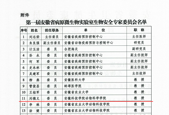 根据《生物安全法》《病原微生物实验室生物安全管理条例》有关规定,日前,安徽省卫生健康委员会、安徽省农业农村厅下发了《关于组建第一届安徽省病原微生物实验室生物安全专家委员会的通知》,我校动物科学学院院长刘德义教授被遴选为第一届安徽省病原微生物实验室安全专家委员会委员。
