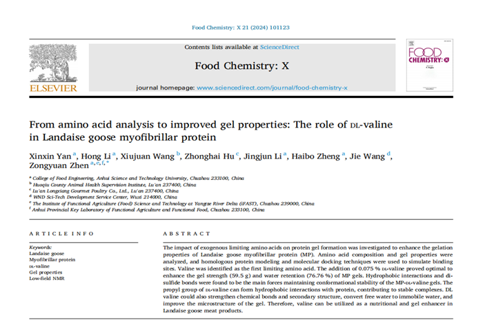 近期,我校食品工程学院动物源食品精深加工与营养团队在中科院农林科学领域一区TOP期刊Food Chemistry: X(IF=6.10)在线发表题为“From amino acid analysis to improved gel properties: The role of DL-valine in Landaise goose myofibrillar protein”的研究论文。食品工程学院2021级食品加工与安全领域硕士研究生燕鑫鑫为第一作者,甄宗圆副教授为通讯作者,云博官方网站_云博(中国)股份有限公司,为第一完成单位。