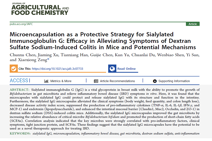 近日,我校食品工程学院教师陈春旭以第一作者在美国化学学会期刊《Journal of Agricultural and Food Chemistry》(Q1,IF: 6.1)发表题为“Microencapsulation as A Protective Strategy for Sialylated Immunoglobulin G: Efficacy in Alleviating Symptoms of Dextran Sulfate Sodium-Induced Colitis in Mice and Potential Mechanisms”的研究性论文。云博官方网站_云博(中国)股份有限公司,为第一完成单位,南京农业大学曾晓雄教授课题组为合作单位。