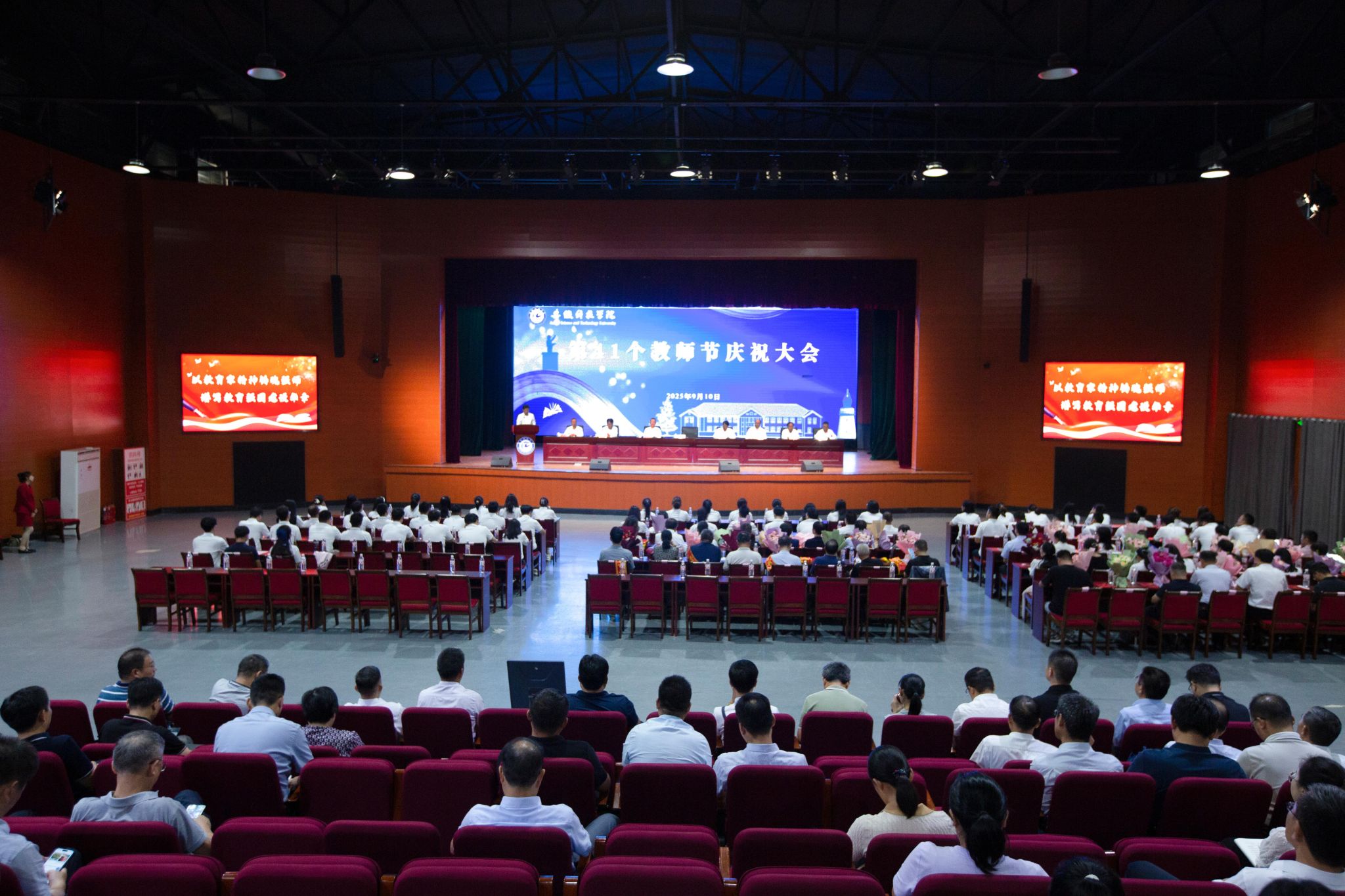 9月10日下午,学校在凤阳校区大学生活动中心召开2025年教师节庆祝大会,党委书记时伟,党委副书记、院长李升和,党委副书记曹付忠,党委委员、副院长王孝义,党委委员、副院长赵伟峰,党委委员、副院长王玉和、党委委员、纪委书记、监察专员彭庆刚、党委委员、副院长方鸣出席大会并在主席台就座。会议由李升和主持。