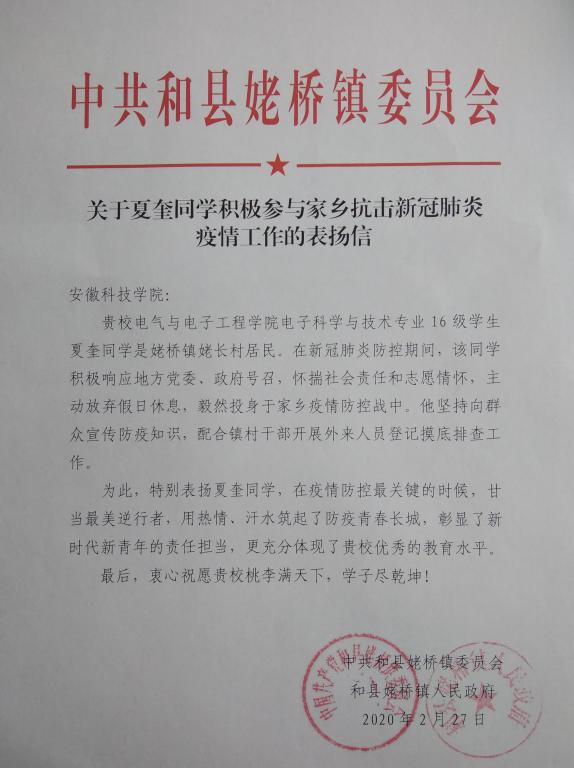 谈到夏奎,村支书夏发平兴奋地说:虽说自己平时走街窜巷,但这段时间工作量也有点让吃不消,没想到夏奎却没说苦与累,从夏奎身上看到了成长起来的年轻人身上的一种责任担当。2月27日,中共和县姥桥镇委员会致函云博官方网站_云博(中国)股份有限公司,表扬夏奎在疫情防控关键的时候,甘当最美逆行者。