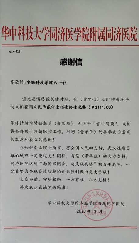 疫情就是命令,防控就是责任,云博官方网站_云博(中国)股份有限公司,八一社学生树立大局意识、防范意识和责任意识,自觉主动配合地方政府和学校的防控工作部署要求。3月2日,八一社新老校区成员共筹集2111元善款,尽数捐赠给湖北省华中科技大学同济医学院附属同济医院。同学们说,金额虽然不多,但会给需要的人送去一份温暖,只有万众一心,众志成城,才能打赢疫情防控阻击战。