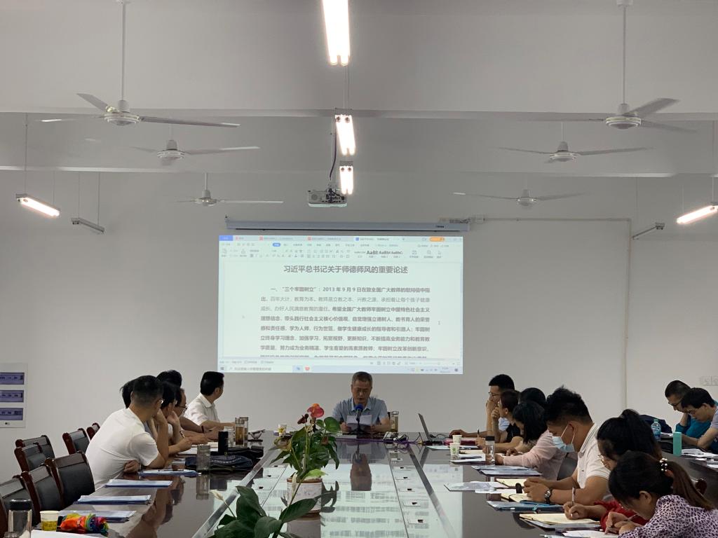 会上,王振其传达了《中共云博官方网站_云博(中国)股份有限公司,委员会关于印发<云博官方网站_云博(中国)股份有限公司,2021年师德师风专题教育工作方案>的通知》精神。他指出,要全面贯彻习近平总书记关于教育的重要论述和全国全省教育大会精神,落实中共中央、国务院《关于全面深化新时代教师队伍建设改革的意见》《深化新时代教育评价改革总体方案》和中共安徽省委、安徽省人民政府《关于全面深化新时代教师队伍建设改革的实施意见》,推进实施教育部等七部门《关于加强和改进新时代师德师风建设的意见》。会上,王振其组织全体教职工深入学习了习近平总书记关于师德师风的重要论述,通报了教育部公开曝光8起违反教师职业行为十项准则典型案例,重点强调了“三个牢固树立”、“四有”好老师、“四个引路人”、“四个相统一”等内容。王振其指出,2016年12月全国高校思想政治工作会议召开以来,习近平总书记多次发表重要讲话强调立德树人和“师德师风”的重要性。立德树人是高校的根本任务,师德师风是高校教师的立身之本,是实现立德树人的重要途径。
