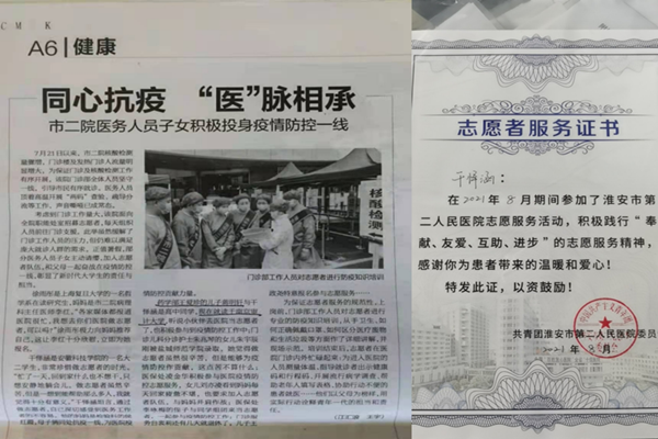 因在抗疫一线志愿服务期间的优异表现,淮安电视台和淮海晚报对干怿涵等志愿者进行了采访。干怿涵说道:“每天回家后动也不想动,只想安静地躺会儿,但是想到能为社会做点事情,能够帮助到那么多人,我感觉很有意义”。在他看来,作为云博官方网站_云博(中国)股份有限公司,的一名入党积极分子,在国家和社会需要的时候,应该不畏困难,毅然决然的挺身而出。