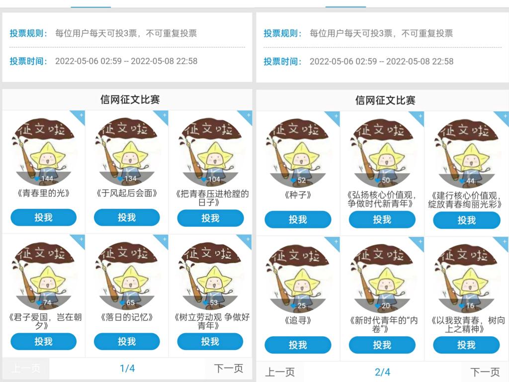 本次活动分初赛和决赛环节。近50余份作品参加比赛,参赛者围绕主题,从坚定个人理想信念、弘扬社会主义核心价值观、追逐梦想,青春奋斗等方面提交作品,展现了同学们的深厚爱国爱校的情怀、共同抗疫决心与开拓进取的精神等。经过评选,共20份参赛作品进入决赛,决赛作品、比赛评选结果在学院官方QQ、易班微社区等平台公示,并在易班平台开展线上投票,扩大活动影响力。经过一系列的遴选评比,最后《春天里的光》《于风起后会面》《把青春压进枪膛的日子》《君子爱国,岂在朝夕》《落日的记忆》《树立劳动观,争做好青年》《种子》《弘扬核心价值观,争做时代新青年》《践行核心价值观,绽放青春绚丽光彩》《追寻》等10组选为获奖作品。