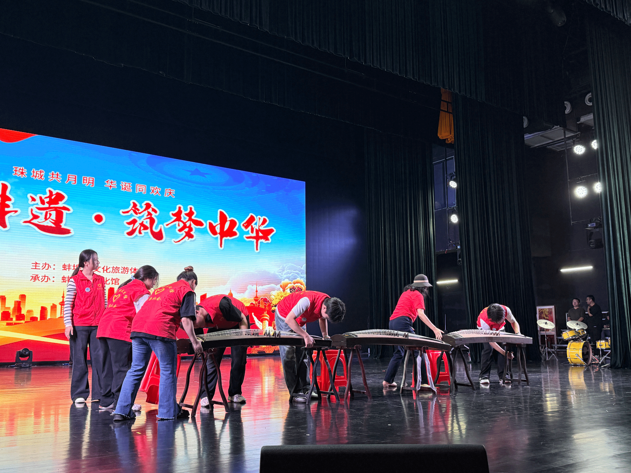 在蚌埠市文化馆,“非遗筑梦中华”系列文艺汇演精彩纷呈。为保障演出顺利进行,志愿者们于10月1日至5日全程参与后台服务。面对演出换场时间紧、任务重的挑战,志愿者们结合专业学习中培养的空间感知和组织协调能力,认真熟悉节目流程和道具需求,提前规划搬运路线和摆放位置。团队成员分工明确、相互配合,在实践中不断优化协作方式,努力做到搬运有序、到位及时,有效保障了各场次演出的顺利进行。