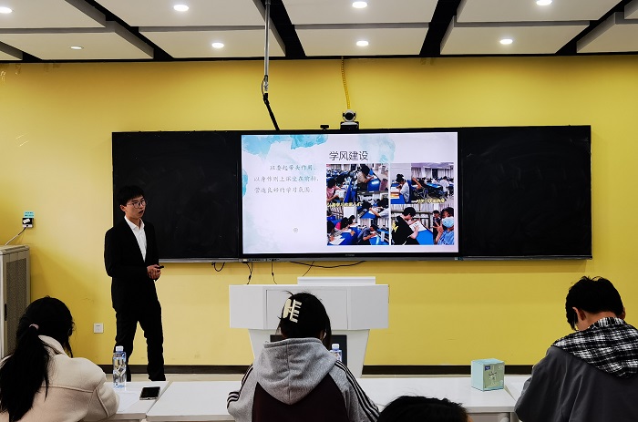 本次答辩会共有16个班级参与展示。答辩环节,各班代表从班级组成、集体荣誉、学风建设、学术科研、获奖情况、班团活动和实践活动等多个角度综合阐述。评委们抓住每个班级的亮点进行提问,在强调班级优点的同时,也指出了一些指导性的建议或意见。整个答辩会充分展示了各班同学团结合作、热爱学习、积极进取、乐观向上的良好精神风貌。答辩评委认真倾听大家的介绍,并在仔细审阅答辩班级申报材料的基础上,综合班级代表现场答辩表现情况进行严谨评分。
