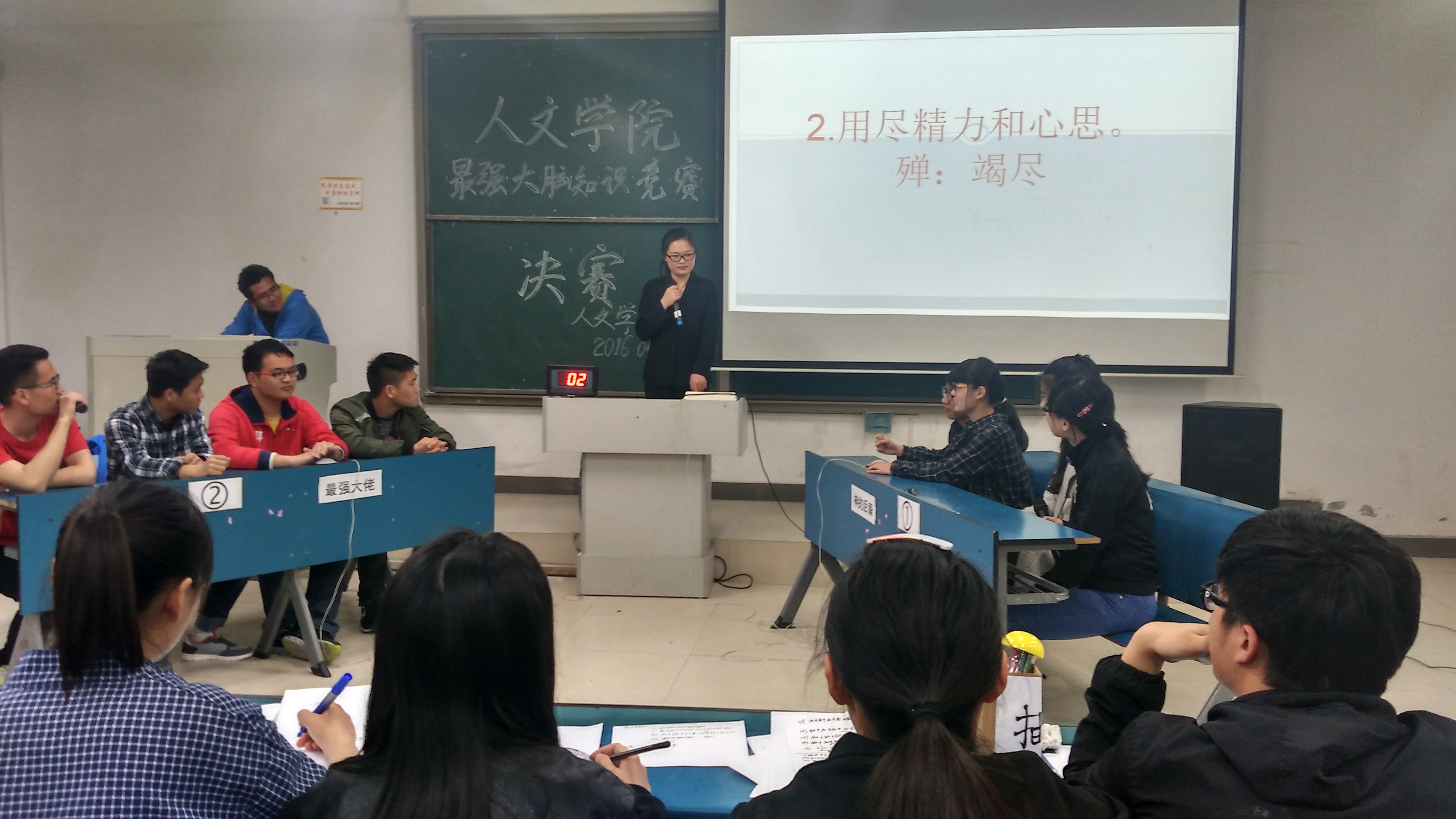 4月16日晚,人文学院在新B301教室举办首届“最强大脑”决赛,比赛共有八支队伍参赛。人文学院学生会办公室副主任杨行、宣传部副部长许倩茹、创新创业部副部长倪强盛、体育部副部长桂大震担任评委,比赛由樊沙沙主持。