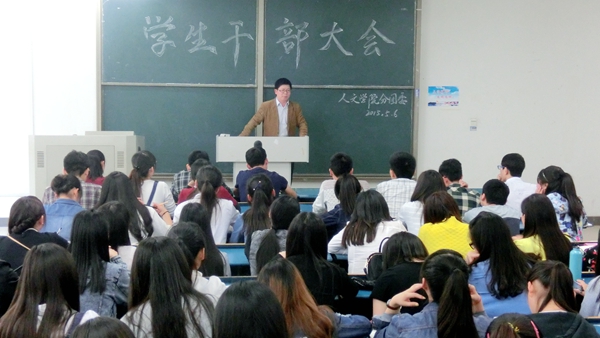 5月6日下午,人文学院在新A202教室召开全体学生干部大会。党总支副书记王伟,党总支秘书、分团委书记李月月,辅导员李沙娜及全体学生干部参加会议。会议由李沙娜主持。