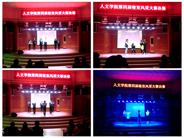 4月11日晚上,人文学院在学术报告厅举行了第四届寝室风采大赛决赛。人文学院党总支书记杜士凤,党总支秘书、团总支书记李月月,辅导员李沙娜到场观看比赛。人文学院辅导员黄钦海、人文学院学生会主席李雪丰、校学生会副主席候鹤喜、外国语学院学生会生活部部长于冉冉、校街舞队AK队队长李诚心担任此次决赛的评委。此次活动由斯凡和汪文主持。