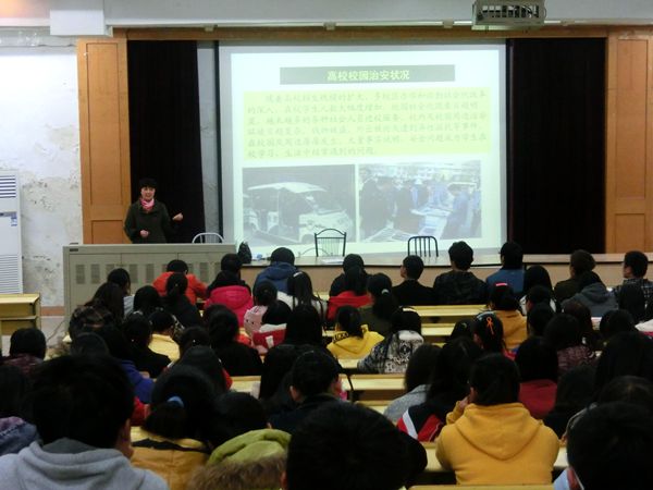 随后她围绕防盗安全、防骗安全、防火安全、防劫安全、交通安全、饮食安全;、用电安全、课堂安全、运动安全、交往安全、女同学自身安全、造成他人安全隐患的行为等十二方面讲述了大学生常见的安全问题及防范技巧。