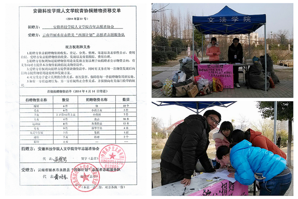 随着生活水平的提高,校园浪费现象也日趋严重。并不旧的旧衣服,不再流行的包,用了半截的铅笔,想扔但却舍不得的半旧鞋子……志愿者们为了让这部分资源再获新生实现价值,想到了收集起来捐给需要他们的西部农村孩子。3月,人文学院青协联系上了远在云南参加西部计划的我校校友。在校友的帮助下,与云南省丽水市永胜县“西部计划”志愿者服务队取得联系。得到了当地急需的物品信息。3月8日至9日,人文学院以“情系永胜学子,暖送人文真情”为主题在全校范围内组织开展了爱心捐赠活动。征集当地孩子急需的学习用品、体育器材以及旧衣服等。