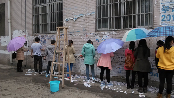 广告乱张乱贴,严重影响校内环境,可以说是校园的顽疾,屡禁不止。为规范校园宣传,美化校园环境,学校也出台了《关于进一步加强校园张贴物及悬置物治理的通知》文件规定。各志愿者协会也经常以运动式的组织活动,集中整治和清理。但“广告撕不尽,隔夜又重生”,各社团也是费了牛劲,也难以规范和杜绝。人文青协也与兄弟社团一样一直组织集中的清理活动,但在活动中,志愿者们逐步认识到建设美丽校园并非一朝一夕之功,既然张贴方的活动频率大大高于清理方,为何不提高清理的频率呢?为此,本学期初,人文学院青协主动向校党委宣传部提出清理区域承包申请,经宣传部批准,承包了彩虹桥及附属区域的张贴物日常清理工作。拿到区域后,志愿者制定了日常清理计划,责任到人,轮番清理。除了一周三次的日常清理之外,每月还有一次彻底大扫除。承包以后,随着清理频率的提高,区域内乱张乱贴情况大为改观。真正为创造一个干净、整洁、文明、和谐的校园环境贡献了自己的力量。