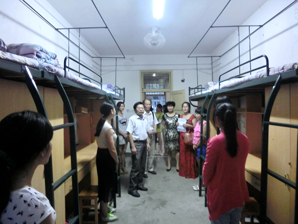 9月7日,我院新生入学报道工作基本顺利结束。为更好的了解新生的入住情况,解决新生入学期间的困难,7日晚,学院党总支书记陈传万、院长吴贵春、党总支副书记杜士凤、团总支书记李月月在14级新生辅导员李沙娜的陪同下走访了全部36间2014级新生宿舍。