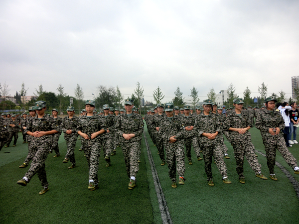都说女子不如男,然而在众多连队中,一个个身着米彩服的女兵方队尤为耀眼。挺拔军姿,清脆号令,神情专注,丝毫没有输给男生的态势。此时她们正在训练踢正步,随着教官的号令,抬头、挺胸、抱腹、踢腿、正步走,随后,在教官的分配下,她们分成一排排,每排的排头喊口号,带领一排同学进行训练,虽然训练很累很枯燥,但她们却都认真对待,即使教官不在旁边依然保持高度紧张状态,对训练丝毫不懈怠。