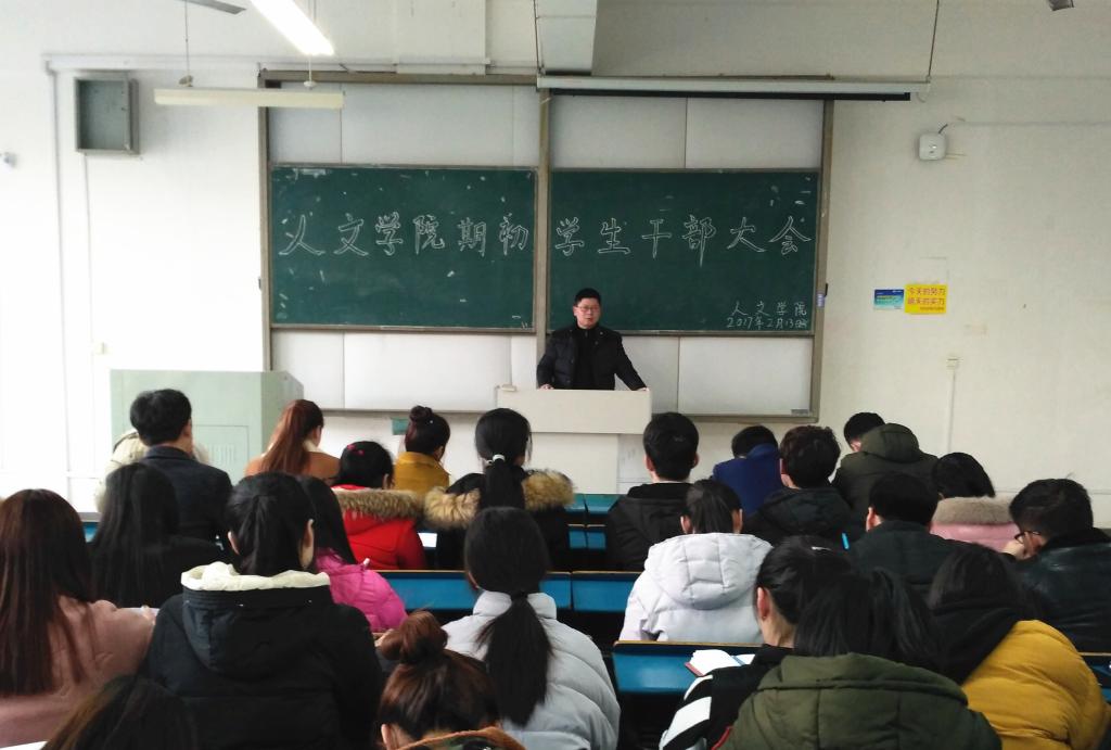 2月13日下午,人文学院在新A108教室召开新学期学生干部大会。学院党总支副书记王伟,分团委书记、党总支秘书李月月,正科级辅导员李沙娜,学生会副部级以上负责人、各班级主要学生干部参加会议。会议由兼职辅导员郭静主持。
