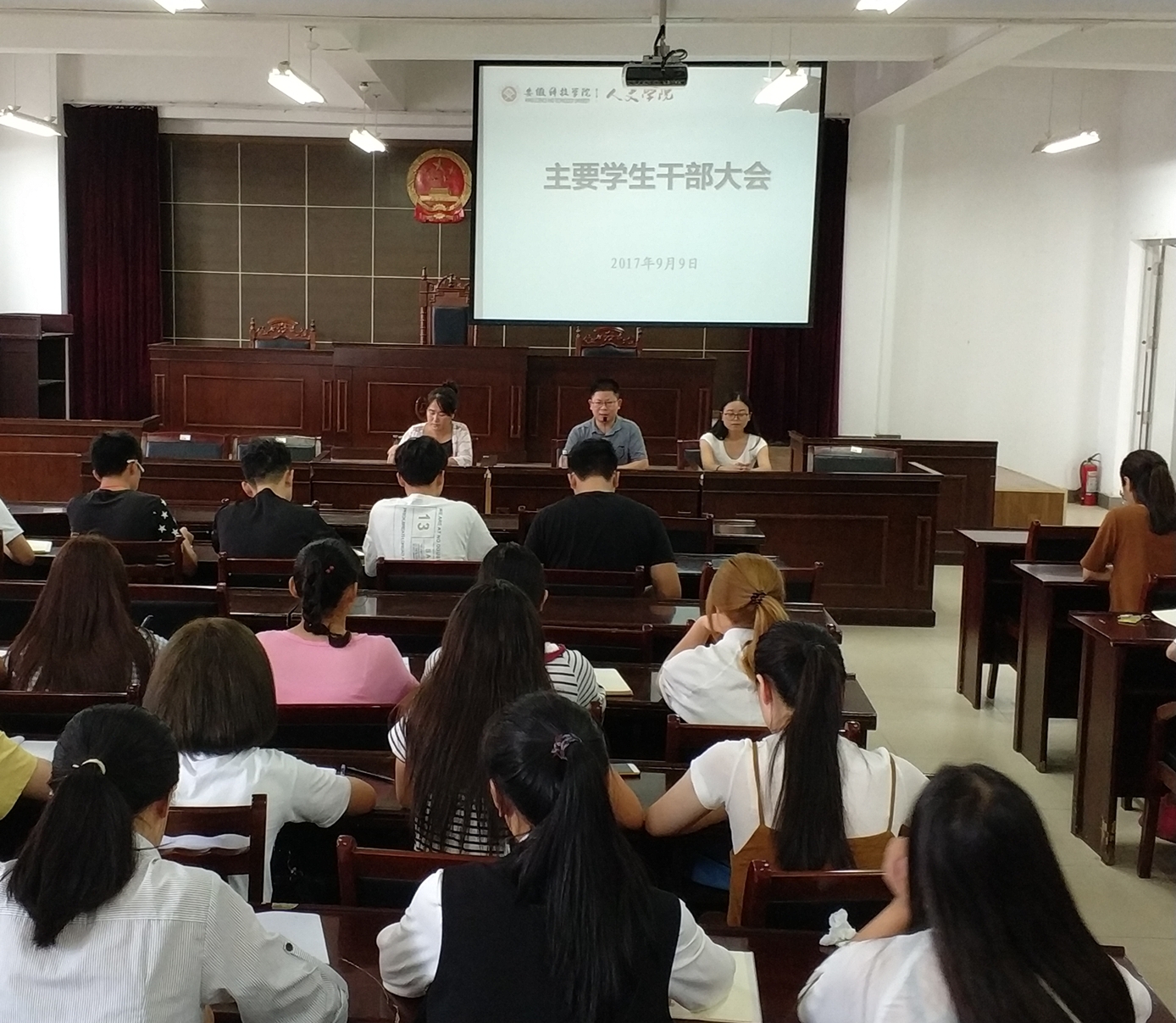 9月9日下午,人文学院在模拟法庭召开主要学生干部大会。党总支副书记王伟、辅导员李沙娜、曹珊珊出席会议。学生会和各班级主要学生干部参加会议。会议由李沙娜主持。