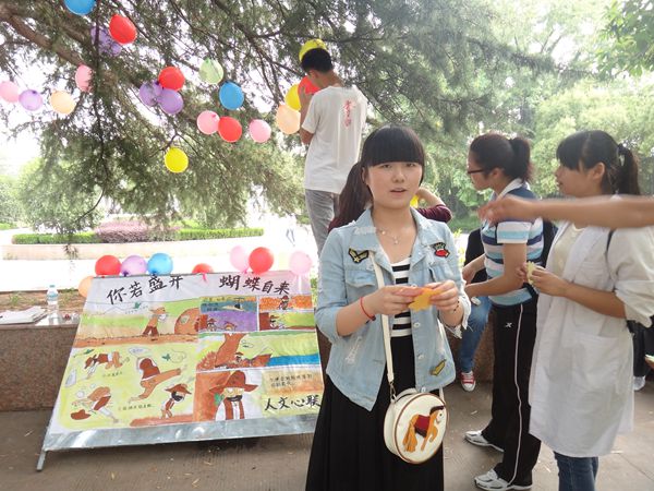 5月25日下午,人文学院在东区小广场开展了“幸运四叶草”许愿活动。活动现场布置新颖,而尤为引人注目的漫画展板——“你若盛开,蝴蝶自来”,更是成为本活动的亮点。工作人员向过往师生发放四叶草形状的便利贴,并请他们在四叶草上写下自己想要实现的愿望,然后亲手贴在带有彩色气球的幸运红线上,活动现场气氛活跃。