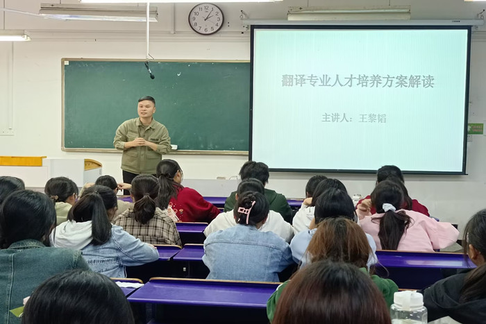 翻译专业人才培养方案由翻译教研室教师王黎韬主讲。王黎韬深入剖析了翻译专业对语言服务能力的重要性,详细介绍了课程设置对语言服务能力提升的目标支撑,结合本校“新文科”建设的规划和大农科的传统优势,重点介绍了翻译专业未来服务社会的两个重要方向“文学翻译”和“农林翻译”。最后,他从“为人”“为学”“为国”等方面对学生如何实现德智体美劳全面发展,成为知识结构优、实践能力强、敬业精神强、创新创业意识强的高素质应用型人才提出明确要求。