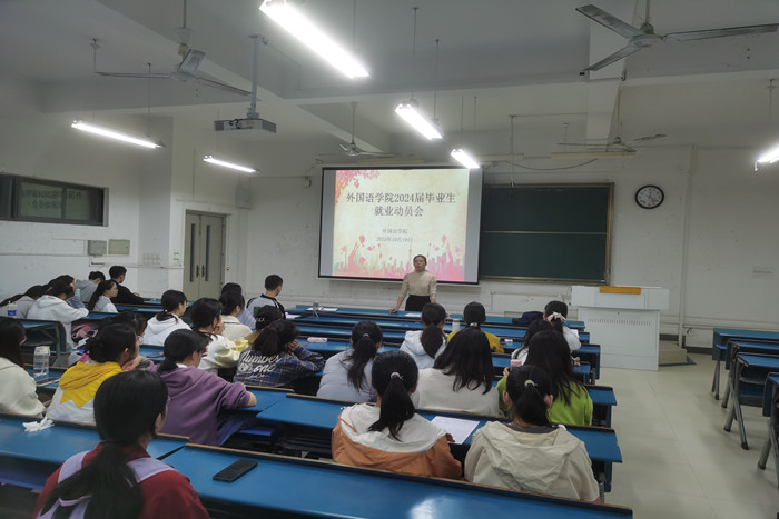 为进一步做好2024届毕业生的就业指导工作,帮助毕业生了解就业形势,提升就业能力,外国语学院于10月19日16:00在新B304召开2024届毕业生就业动员大会。学院党委书记蔡为青、毕业班辅导员陈慧中以及2024届全体毕业生参加会议。会议由陈慧中主持。