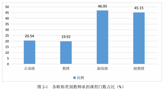 副高级职称教师承担的课程门数为832,占总课程门数的46.95%;课程门次数为1648,占开课总门次的33.97%。其中副教授职称教师承担的课程门数为800,占总课程门数的45.15%;课程门次数为1586,占开课总门次的32.69%