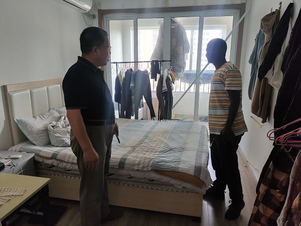 5月9日,国际交流与合作处处长何世潮等赴滁州校区看望在该校区学习的留学生Solomon和Emmanuel。何世潮首先在长三角功能农业(食品)研究院察看了两位国际学生的学习场所和环境,随后又赶赴碧湖云溪居民小区实地查看了他们的生活公寓。何世潮和两位国际学生亲切拉家常,细聊他们学习和生活以及在中国留学的感受。两位国际学生对目前的状况感到很满意,感谢学校对他们的体贴关心,感谢导师对他们的悉心教导,他们非常喜欢中国教育和文化,在中国生活很安心,学习有收获。