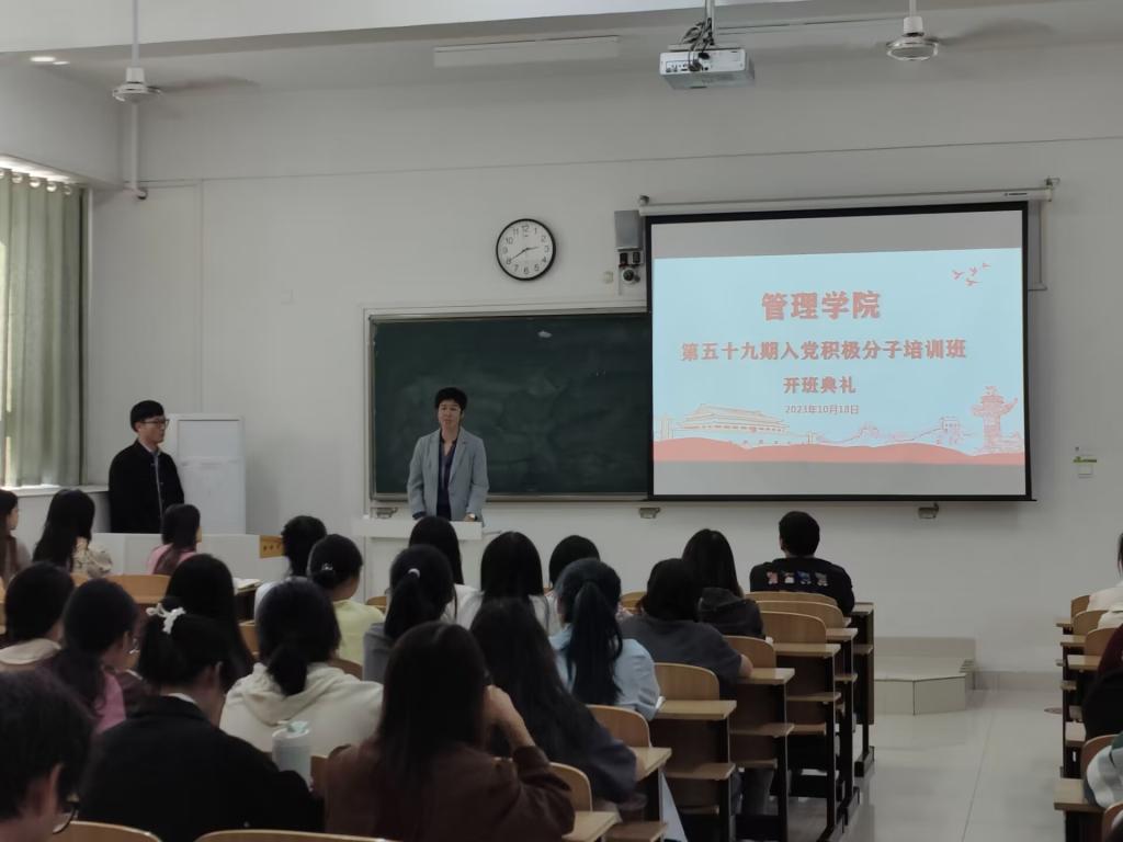 为深入学习贯彻党的二十大精神,引导入党积极分子端正入党动机,提高党性修养,更积极地向党组织靠拢。10月18日下午,管理学院于龙湖校区致知楼C107教室举行了第59期入党积极分子培训班开班仪式。学院党委副书记陶漫、各党支部书记和96名第59期入党积极分子参加开班仪式,仪式由黄斐老师主持。