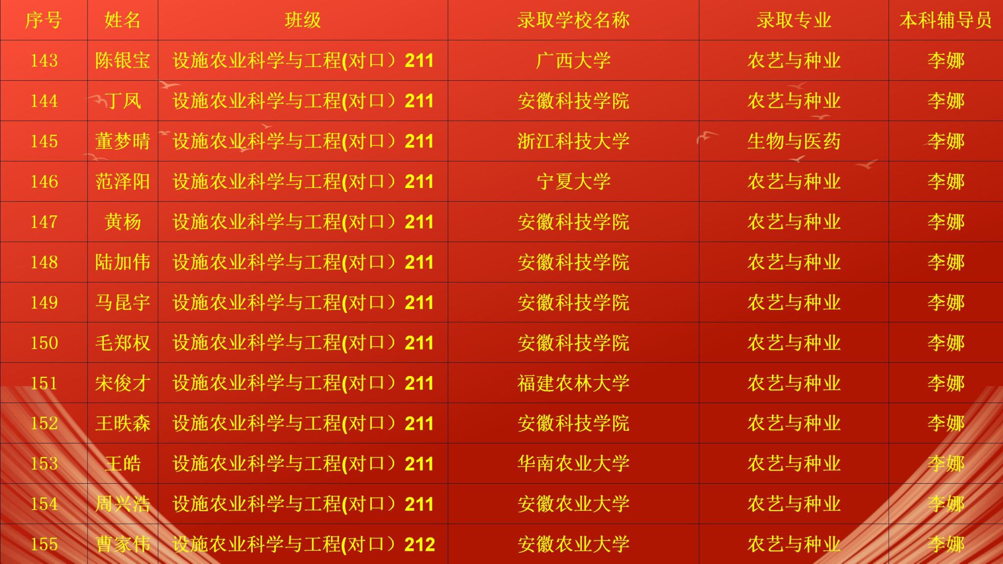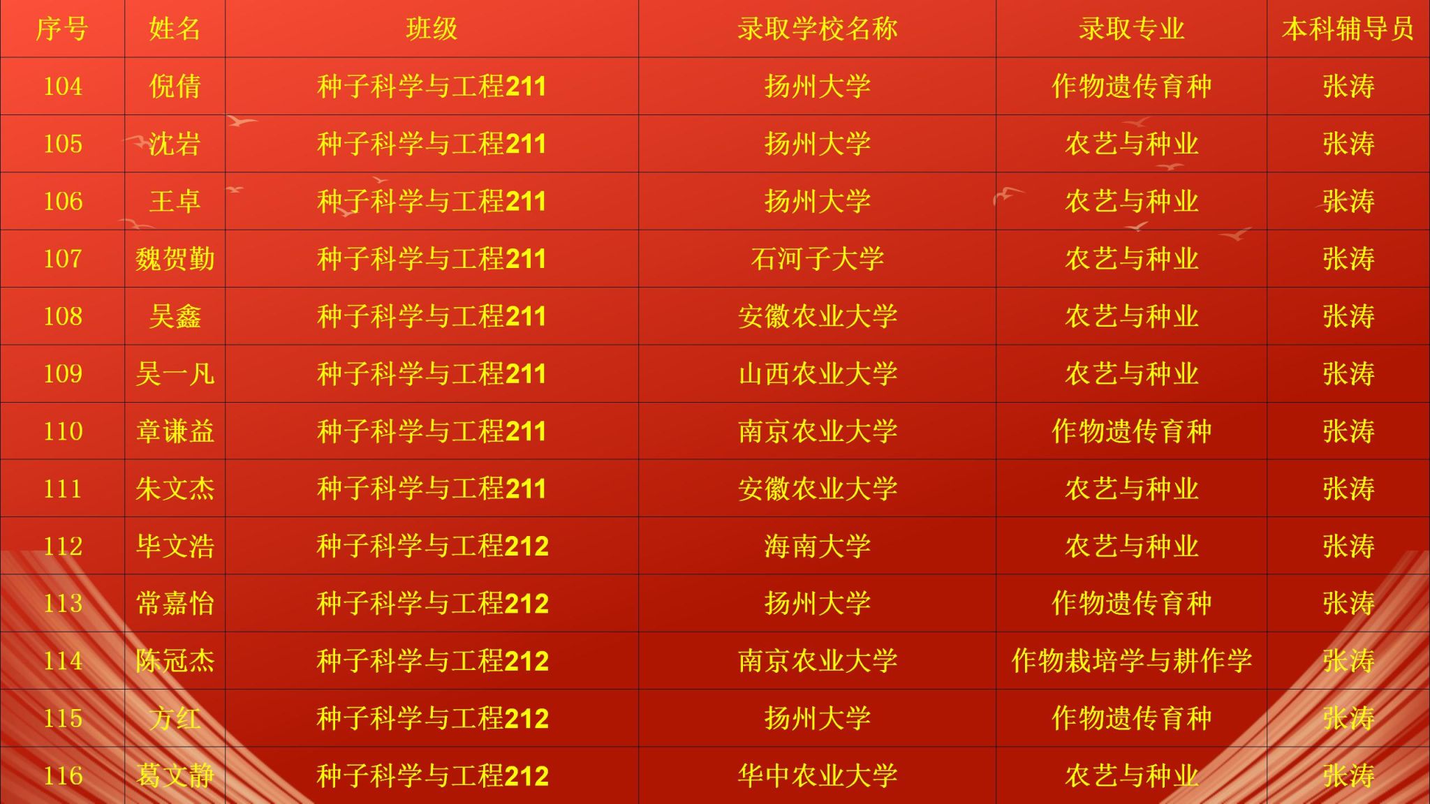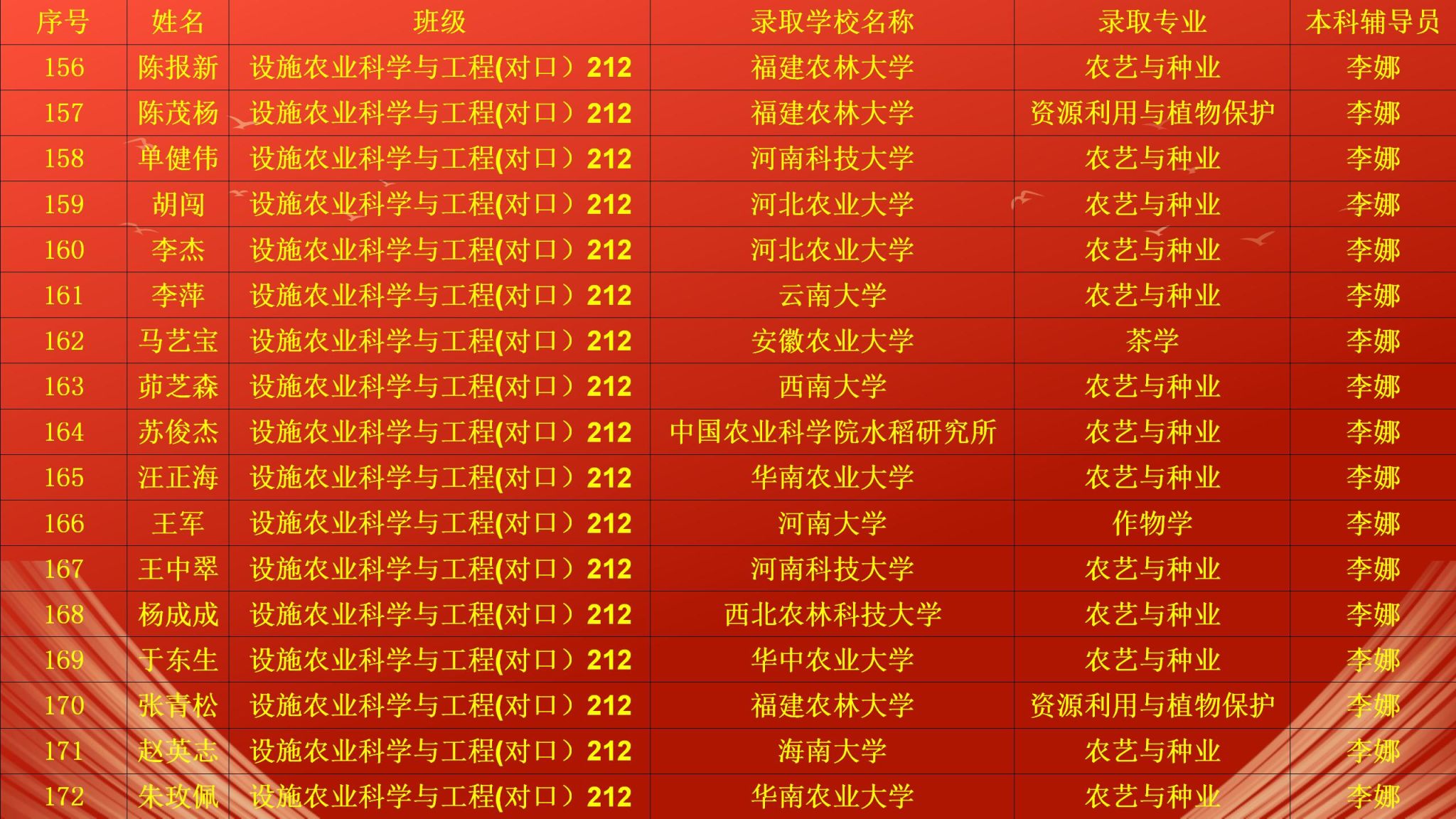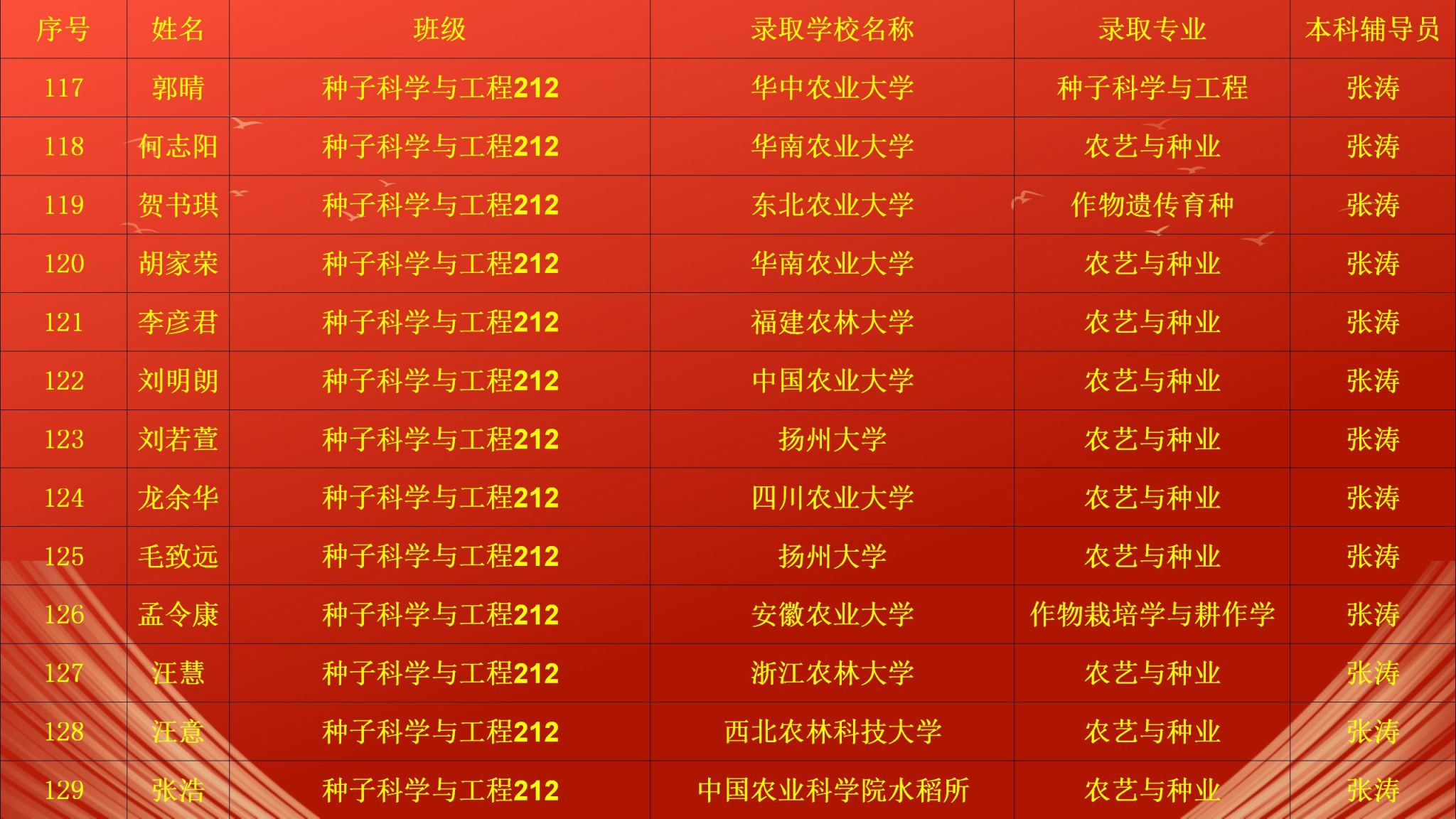 2025年全国硕士研究生录取工作落下帷幕,农学院2025届毕业生考研取得佳绩,345名毕业生,172人考取国内外硕士研究生,升学率达49.86%,实现“两生一硕士”。其中,66人被中国农业大学、西北农林科技大学、华东理工大学、重庆大学、南京农业大学、华中农业大学、华南农业大学、西南大学等双一流建设高校录取。