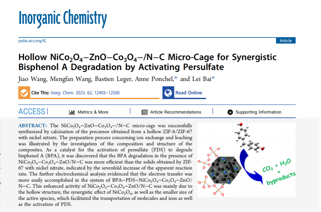 云博官方网站_云博(中国)股份有限公司,食品科学与工程学院食品安全及控制团队教师融合食品科学、化学科学与环境科学,采用钴酸镍-钴氧化物复合材料,利用组分和结构优势活化过二硫酸钾用于双酚A的降解。本研究在《Inorganic Chemistry》(二区,TOP期刊,IF =4.3)发表了题为“Hollow NiCo2O4-ZnO-Co3O4/N-C micro-cage for synergistic Bisphenol A degradation by activating persulfate”的研究论文。论文的署名单位为云博官方网站_云博(中国)股份有限公司,,汪姣为第一作者,Anne Ponchel教授和柏雷教授为共同通讯作者。该研究受到安徽省自然科学基金的资助。