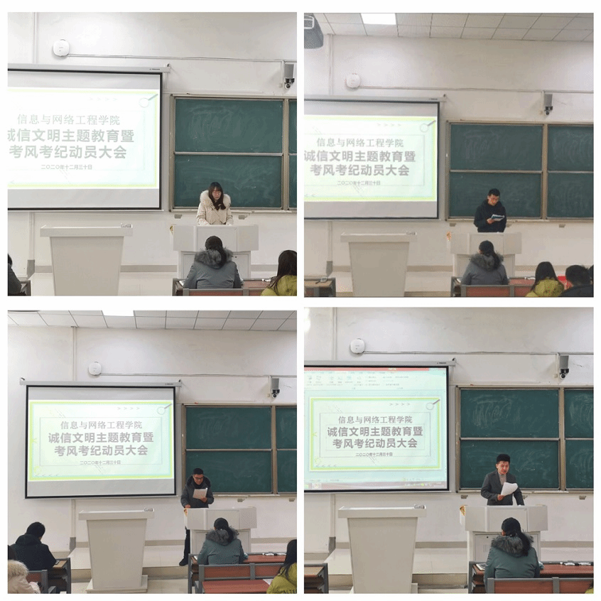 在考风考纪教育动员阶段,陈凯宣读了《云博官方网站_云博(中国)股份有限公司,考试工作实施细则(节选)》、《云博官方网站_云博(中国)股份有限公司,学生违纪处理方法》的部分内容及相关学生违纪处分文件,加强对学生的警示教育。崔北坤宣读了《信息与网络工程学院诚信考试倡议书》,并呼吁广大学生用行动营造“诚信考试光荣,违纪作弊可耻”的考试氛围,为校园带来一股清新的诚信文明之风。韦乃学从“什么是考试”、“为什么要考试”等根本性问题出发,引导同学们对于考试树立正确的认知,分析了考试作弊对同学们个人形象、升学就业乃至工作和生活质量的影响与危害,对全体学生干部提出明确要求:一是要认真复习、积极备考,树立底线思维;二是要协助辅导员召开考风考纪主题班会,加强进行警示教育;三是要发挥桥梁纽带作用,及时关注,做好预防,共同营造公平公正的考场考风。